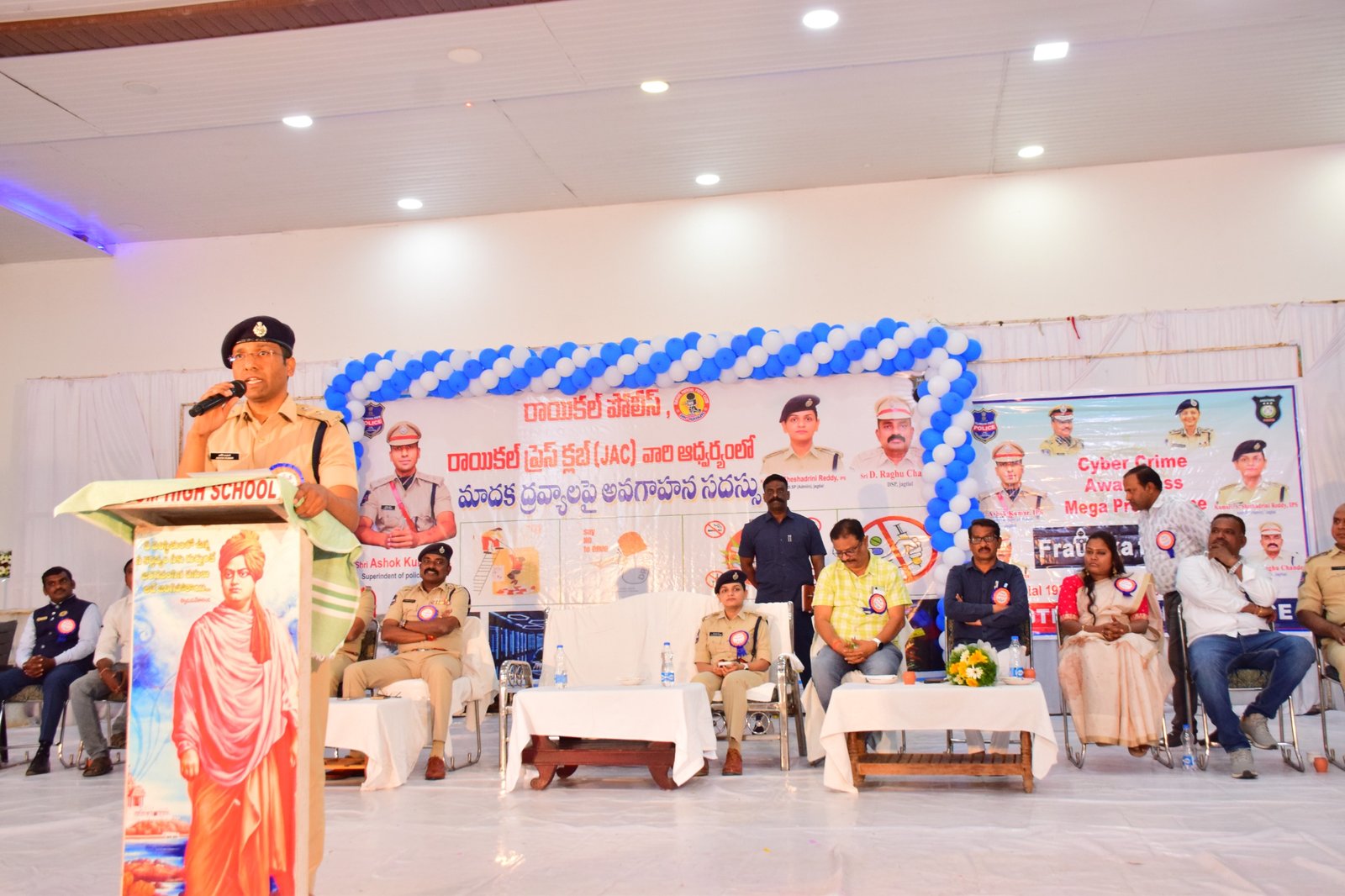 డ్రగ్స్, మాదకద్రవ్యాల మహమ్మారిని సమాజం నుండి పూర్తిగా నిర్మూలించి భావితరాలకు ఆరోగ్యకరమైన, సురక్షితమైన భవిష్యత్తును అందించాలనే లక్ష్యంతో జిల్లా పోలీస్ శాఖ ఆధ్వర్యంలో జిల్లా వ్యాప్తంగా విద్యాసంస్థల్లో చదువుతున్న విద్యార్థులకు నిరంతరం అవగాహన కార్యక్రమాలు నిర్వహించడం జరుగుతోందని జిల్లా ఎస్పీ అశోక్ కుమార్ తెలిపారు. బుధవారం రాయికల్ మండల కేంద్రంలో గల ఆర్ఆర్ గార్డెన్స్ లో జిల్లా పోలీస్ శాఖ రాయికల్ ప్రెస్ క్లబ్ ఆధ్వర్యంలో ఏర్పాటు చేసిన డ్రగ్స్ వ్యతిరేక అవగాహన కార్యక్రమానికి జిల్లా ఎస్పీ అశోక్ కుమార్ ముఖ్య అతిథిగా హాజరై విద్యార్థులను ఉద్దేశించి ప్రసంగించారు.ఈ సందర్భంగా జిల్లా ఎస్పీ మాట్లాడుతూ, డ్రగ్స్, మాదకద్రవ్యాలకు బానిసలవడం వల్ల యువత భవిష్యత్తు పూర్తిగా నాశనం అవుతుందని హెచ్చరించారు. విద్యార్థులు తమ లక్ష్యాలపై దృష్టి సారించి, మంచి చదువుతో పాటు క్రీడలు, సృజనాత్మక కార్యక్రమాల్లో పాల్గొంటూ ఆరోగ్యకరమైన జీవనశైలిని అలవర్చుకోవాలని సూచించారు. డ్రగ్స్ వినియోగం వల్ల శారీరక, మానసిక ఆరోగ్య సమస్యలతో పాటు కుటుంబాలు విచ్ఛిన్నం కావడం, నేరాలకు పాల్పడే పరిస్థితులు ఏర్పడతాయని తెలిపారు. డ్రగ్స్ సరఫరా, వినియోగంపై జిల్లా పోలీస్ శాఖ కఠిన చర్యలు తీసుకుంటుందని స్పష్టం చేశారు. ప్రతి ఒక్కరూ మాదకద్రవ్యాలకు దూరంగా ఉండాలని, రాబోయే రోజుల్లో మాదకద్రవ్యాల నిర్మూలనలో కీలక పాత్ర పోషించేది నేటి తరం విద్యార్థులేనని పేర్కొన్నారు. విద్యార్థుల దృష్టి పూర్తిగా తమ విద్య, కెరీర్పై ఉండాలని, నిషేధిత డ్రగ్స్ మరియు ఇతర మత్తు పదార్థాల వైపు ఆకర్షితులు కాకూడదని సూచించారు. అధిక ఒత్తిడిని ఎదుర్కొనేందుకు మత్తు పదార్థాలను ఆశ్రయించకుండా, సానుకూల మార్గాలను ఎంచుకోవాలని తెలిపారు. స్నేహితుల ఒత్తిడితో చెడు మార్గాల వైపు అడుగులు వేయరాదని హెచ్చరించారు. మాదకద్రవ్యాల బారిన పడుతున్న యువతను కాపాడేందుకు జిల్లా పోలీస్ శాఖ కృషి చేస్తోందని, అందులో భాగంగా విద్యాసంస్థలు, గ్రామాల్లో అవగాహన కార్యక్రమాలు నిరంతరం నిర్వహించడం జరుగుతోందని అన్నారు. మత్తు పదార్థాల నివారణ కోసం యువత, విద్యార్థులు యాంటీ డ్రగ్స్ కమిటీలలో సభ్యులుగా చేరి యాంటీ డ్రగ్స్ సోల్జర్ లుగా సహకరించాలని పిలుపునిచ్చారు. ఉపాధ్యాయులు విద్యార్థుల ప్రవర్తనను ఎప్పటికప్పుడు గమనిస్తూ, వారు ఎలాంటి చెడు అలవాట్లకు బానిసలు కాకుండా జాగ్రత్తలు తీసుకోవాలని సూచించారు. విద్యార్థులు ఎవరైనా డ్రగ్స్కు సంబంధించిన సమాచారం గమనించిన వెంటనే పోలీసులకు తెలియజేయాలని, సమాచారం అందించిన వారి వివరాలు పూర్తిగా గోప్యంగా ఉంచడం జరుగుతుందని జిల్లా ఎస్పీ స్పష్టం చేశారు.ఈ కార్యక్రమంలో అదనపు ఎస్పీ శేషాద్రిన
