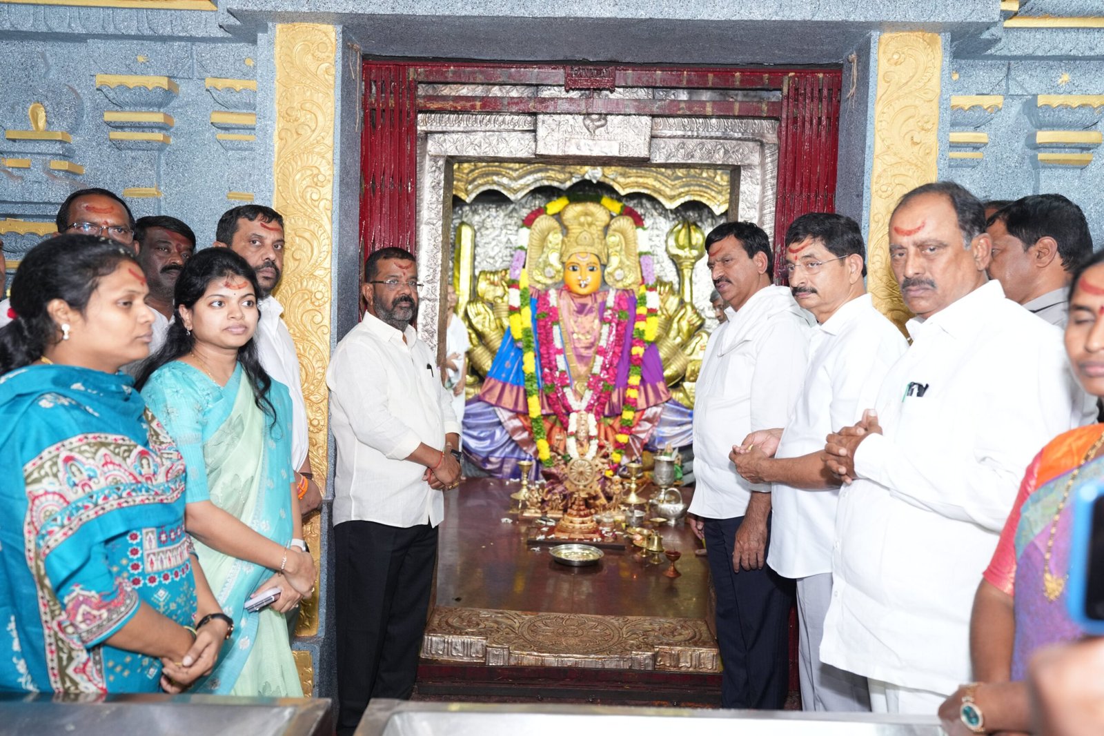 వరంగల్ జిల్లాలోని భద్రకాళి దేవాలయంలో అమ్మవారిని దర్శించుకుని ప్రత్యేక పూజలుచేసిన రెవెన్యూ శాఖ మంత్రి పొంగులేటి శ్రీనివాస్ రెడ్డిఅనంతరం భద్రకాళి దేవాలయ అభివృద్ధి పనుల గురించి అధికారులతో చర్చించారు ఈ సందర్భంగా వారు మాట్లాడుతూ వరంగల్ ప్రజలు, హన్మకొండ శాసన సభ్యులు రాజేందర్ రెడ్డి కోరిక మేరకు ముఖ్యమంత్రి రేవంత్ రెడ్డి భద్రకాళి అమ్మవారి దేవాలయాన్ని మహా అద్భుతంగా తీర్చిదిద్దాలని శాస్త్రోత్తంగా మరింత వన్నె తెచ్చే విధంగా చేయాలని, మాడ వీధులు, ఆలయ వెడల్పు ఇతర అభివృద్ధి కార్యక్రమాలను ప్రజా ప్రభుత్వం చేపట్టిందని తెలిపారు..ఆదిలాబాద్ నుండి భద్రాచలం వరకు గోదావరి ఒడ్డున గల ప్రధాన దేవాలయాలన్నింటిని ఒక టెంపుల్ సర్క్యూట్ గా ఏర్పాటు చేసి ఆధ్యాత్మికంగానే కాదు, పర్యాటకంగా కూడా అభివృద్ధి చేసే ప్రణాళికలు చేస్తున్నది ప్రభుత్వం.ఇవన్నీ పూర్తయితే దేశ విదేశాల నుంచి వచ్చే భక్తులు కూడా మన ప్రభుత్వం చేసే గొప్ప ప్రయత్నాన్ని తలుచుకునేలా రాబోయే కొద్ది రోజుల్లోనే ఒక కమిటీని వేసి డీపిఆర్ తయారు చేసుకుని, డబ్బులు ఎంత ఖర్చైనా దేవాలయాలన్నింటిని ఒకే టూరిజం లైన్ లోకి తీసుకురావాలని ఈ ప్రభుత్వం అడుగులు వేస్తుంది. భద్రకాళి అమ్మవారి దేవాలయంలో ఇంకా పెండింగ్ ఉన్న పనులను కొద్ది నెలల్లో పూర్తి చేసి భక్తులకు అందుబాటులోకి తీసుకువస్తాం అన్నారు.ఈ కార్యక్రమంలో ప్రభుత్వ సలహాదారు వేం నరేందర్ రెడ్డి , ఎంపీ కడియం కావ్య ఎమ్మెల్సీ బస్వరాజు సారయ్య ఎమ్మెల్యేలు దొంతి మాధవ రెడ్డి , నాయిని రాజేందర్ రెడ్డి, రేపూరి ప్రకాష్ రెడ్డి ఎమ్మెల్యే కేఆర్ నాగరాజు అధికారులు, మరియు ఆలయ పూజారులు పాల్గొన్నారు.