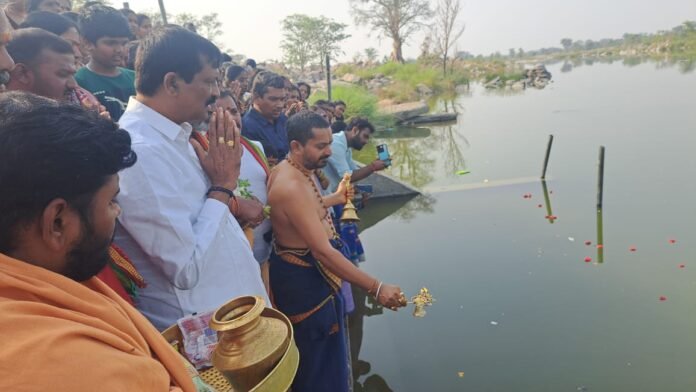 రాష్ట్ర ప్రభుత్వ నుండి రానున్న గోదావరి పుష్కరాలకు అత్యధికంగా కోరుట్ల నియోజకవర్గంకు నిధులు కేటాయించేలా కృషి చేస్తానని రాష్ట్ర కాంగ్రెస్ పార్టీ సీనియర్ నాయకులు జువ్వాడి కృష్ణారావు అన్నారు. ధనుర్మాస ఉత్సవాల్లో భాగంగా బుధవారం మల్లాపూర్ మండలంలోని కొత్త దాంరాజ్ పల్లి గోదావరినది తీరంలో నిర్వహించిన శ్రీవారి చక్రస్నానం కార్యక్రమంలో జువ్వాడి కృష్ణారావు పాల్గొన్నారు.ధనుర్మాస ఉత్సవాల్లో భాగంగా ధనుర్మాస ఆరంభం నుండి కోరుట్ల పట్టణంలోని పురాతన శ్రీ వెంకటేశ్వర స్వామి ఆలయంలో అనాదిగా శ్రీ గోదాదేవి రంగనాయకుల కళ్యాణోత్సవం ఘనంగా నిర్వహిస్తున్నారు. ఈఉత్సవాలలో భాగంగా చివరి రోజు కోరుట్ల ఆలయం నుండి మల్లాపూర్ మండలంలోని కొత్త దామరాజు పల్లి గ్రామ సమీపంలో ఉన్న గోదావరి నదిలో శ్రీవారి సుదర్శన చక్రానికి చక్రస్నానం ఘనంగా నిర్వహించడం అనవాయితీగా వస్తున్నది ఈ ఆనవాయితీ లో భాగంగా ఈ సంవత్సరం కూడా ఉత్సవాలను ఘనంగా నిర్వహించారు.ఈ కార్యక్రమంలో జువ్వడి కృష్ణారావు తో పాటు వెంకటేశ్వ స్వామి దేవస్థానం ధర్మకర్తల మండలి అధ్యక్షుడు యతి రాజం నరసయ్య ఆలయ ధర్మకర్తలు నేతి శ్రీనివాస్ కటకం దివాకర్ కోట గంగాధర్ గోడికే రాములు చిలివేరి విజయ్ పద్మ ఈవో విక్రం ఆలయ ప్రధాన అర్చకులు బీ ర్నంది నరసింహాచారి దామరాజ్ పల్లి గ్రామ ప్రజలు భక్తులు కోరుట్ల శ్రీ వెంకటేశ్వర స్వామి ఆలయ సిబ్బంది , భక్తులు అధిక సంఖ్యలో పాల్గొన్నారు