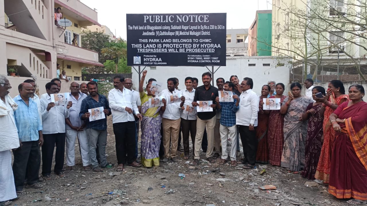 ప్రజా ఆస్తుల పరిరక్షణే ధ్యేయంగా ఏర్పడిన ‘హైడ్రా’ మరోసారి తన పనితనాన్ని చాటుకుంది. తప్పుడు పత్రాలతో పార్కు స్థలాన్ని ఆక్రమించేందుకు ప్రయత్నించిన కబ్జాదారుల ఎత్తులను చిత్తు చేస్తూ.. సుమారు రూ. 25 కోట్ల విలువైన ప్రభుత్వ భూమిని కాపాడింది. పదేళ్లుగా ఈ స్థలం కోసం పోరాడుతున్న కాలనీవాసులకు హైడ్రా కమిషనర్ రంగనాథ్ చొరవతో ఎట్టకేలకు న్యాయం జరిగింది. కుత్బుల్లాపూర్ సర్కిల్, సుభాష్ నగర్ (130) డివిజన్ పరిధిలోని భాగ్యలక్ష్మి కాలనీలో సాయిబాబా ఆలయం పక్కన సుమారు 450 గజాల స్థలం ఉంది. దీనిని లేఅవుట్లో పార్కు కోసం కేటాయించారు. అయితే, ఈ బహిరంగ ప్రదేశంపై కొన్నాళ్లుగా కబ్జాదారుల కన్ను పడింది. తప్పుడు పత్రాలు సృష్టించి, ఆ స్థలాన్ని హస్తగతం చేసుకునేందుకు కొందరు వ్యక్తులు ప్రయత్నిస్తున్నారు. దీనిపై కాలనీ వెల్ఫేర్ అసోసియేషన్ ప్రతినిధులు గత పదేళ్లుగా పోరాటం చేస్తున్నారు. ఈ క్రమంలో కాలనీ ప్రతినిధులు నేరుగా హైడ్రా కమిషనర్ ఏవీ రంగనాథ్ను కలిసి, పార్కు స్థలాన్ని ఆక్రమణదారుల నుంచి కాపాడి తిరిగి కాలనీకి అప్పగించాలని విజ్ఞప్తి చేశారు.
