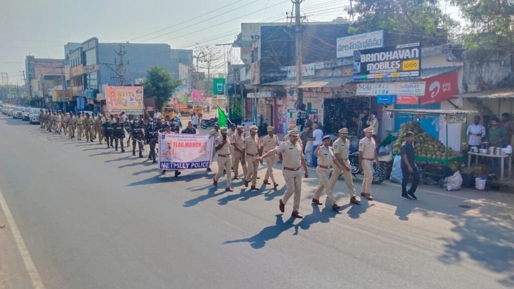 మున్సిపల్ ఎన్నికల నేపథ్యంలో ఎలాంటి అవాంఛనీయ సంఘటనలు జరగకుండా ప్రశాంత వాతావరణంలో ఎన్నికల నిర్వహణకు జిల్లా ఎస్పి అశోక్ కుమార్ ఆదేశాల మేరకు మెట్ పల్లి పట్టణంలో  ఫ్లాగ్ మార్చ్ నిర్వహించడం జరిగింది.ఈ సందర్భంగా మెట్ పల్లి డిఎస్పి రాములు మాట్లాడుతూ ప్రతి ఓటరు ఎలాంటి ఒత్తిడి లేకుండా స్వేచ్ఛగా తమ ఓటు హక్కును వినియోగించుకోవాలి.