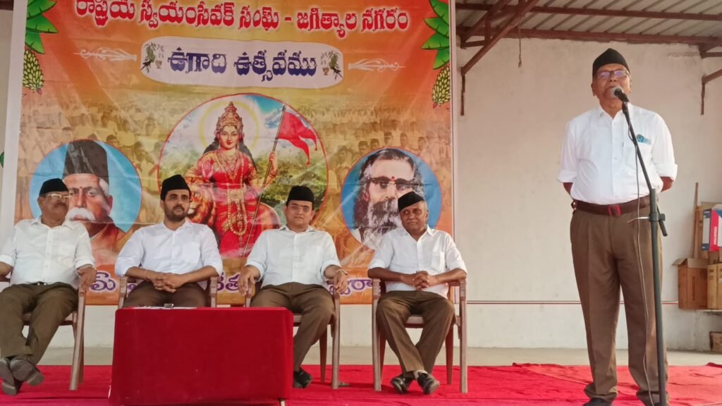 కులం, మతం, భాష, వేషం ఏదైనా మన సంస్కృతి ఒకటేనని భారతదేశాన్ని ఏకం చేసే మన భారతీయ సంస్కృతినీ కాపాడుకోవడానికి ప్రతి ఒక్కరు కృషి చేయాలని రాష్ట్రీయ స్వయంసేవక సంఘం తెలంగాణ ప్రాంత కార్యకారిని సభ్యులు బూర్ల దక్షిణామూర్తి అన్నారు. ఆర్ఎస్ఎస్ జగిత్యాల శాఖ ఆధ్వర్యంలో శనివారం ఉగాది ఉత్సవాన్ని నిర్వహించారు. ఈ సందర్భంగా జగిత్యాల పట్టణ స్వయం సేవకులు పూర్ణ గనవేశతో నగరంలో పథసంచలనం నిర్వహించారు. గీత విద్యాలయం నుండి ఒక వాహిని, హనుమాన్ వాడ బీరప్ప టెంపుల్ నుండి మరోవాహిని పథసంచలనం నిర్వహిస్తూ తాసిల్ చౌరస్తా వద్ద ఒకటిగా కలిసిపోయి విద్యానగర్ రామాలయం వరకు చేరుకన్నారు. దారి పొడవున మహిళలు భగవద్వజానికి పూలు చల్లి స్వాగతం పలికారు. అనంతరం విద్యానగర్ రామాలయ మైదానంలో ఏర్పాటు చేసిన కార్యక్రమంలో ముఖ్య అతిథిగా ప్రముఖ వైద్యులు డాక్టర్ ఓరుగంటి నితిన్ రావు పాల్గొనగా ఆర్ఎస్ఎస్ విభాగ్ సంఘచాలక్ డాక్టర్ భీమనాతిని శంకర్, జిల్లా సంఘచాలక్ డాక్టర్ ఆకుతోట శ్రీనివాస్ రెడ్డి, నగర సంఘచాలక్ పురుషోత్తం పాల్గొన్నారు.