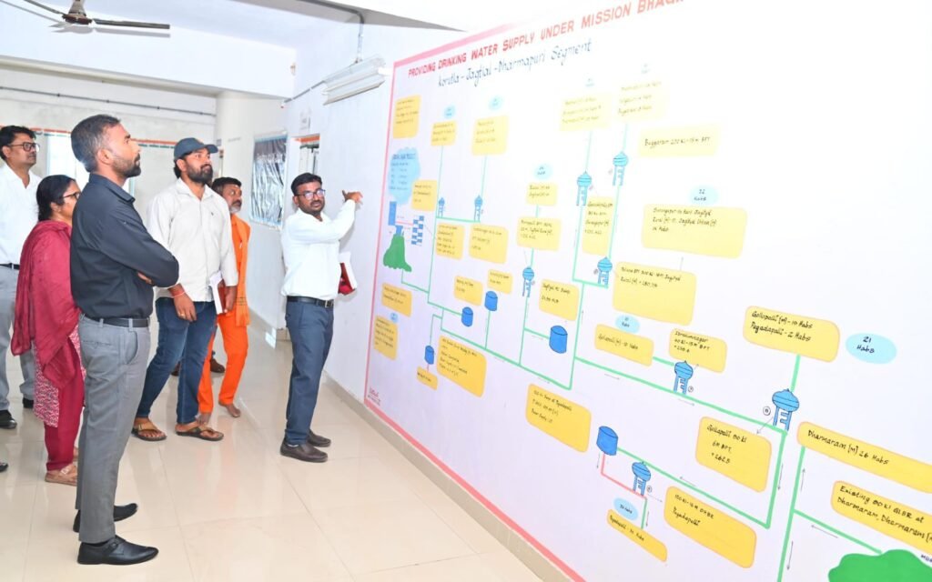 ఫిల్టర్ హౌస్, సెడిమెంటేషన్ ట్యాంకులు, క్లారిఫికేషన్ ప్రక్రియలు, శుద్ధి విధానాలపై సమగ్రంగా ఆరా తీశారు. నీటి శుద్ధి ప్రక్రియలో నాణ్యత ప్రమాణాలు తప్పకుండా పాటించాలని సంబంధిత అధికారులకు సూచించారు. ప్లాంట్ వద్ద నీటి ప్రవాహం, శుద్ధి ప్రక్రియ, పంపిణీ వ్యవస్థలను ప్రత్యక్షంగా పరిశీలించిన అధికారులు, ప్రజలకు అందుతున్న తాగునీరు సురక్షితంగా మరియు నిరంతరంగా ఉండేలా చర్యలు తీసుకోవాలని ఆదేశించారు. ఎక్కడైనా లోపాలు ఉంటే వెంటనే సరిదిద్దాలని, నిర్వహణలో నిర్లక్ష్యం ఉండకూడదని స్పష్టం చేశారు.అనంతరం మిషన్ భగీరథ కార్యాలయాన్ని సందర్శించి సిబ్బందితో సమావేశం నిర్వహించారు. ఈ సందర్భంగా నిర్వహణ, మరమ్మత్తులు, నీటి సరఫరా అంతరాయం లేకుండా ఉండేందుకు తీసుకోవాల్సిన చర్యలపై చర్చించారు. గ్రామాలు, పట్టణాల్లో తాగునీటి సరఫరాలో ఎలాంటి ఇబ్బందులు లేకుండా సమన్వయంతో పనిచేయాలని అధికారులకు దిశానిర్దేశం చేశారు. ప్రజలకు స్వచ్ఛమైన తాగునీరు అందించడం ప్రభుత్వ ముఖ్య లక్ష్యమని, అందుకు అనుగుణంగా ప్రతి దశలో నాణ్యత, సమయపాలనపై ప్రత్యేక దృష్టి పెట్టాలని పేర్కొన్నారు.ఈ కార్యక్రమంలో మెట్ పెల్లి ఆర్.డి.వో నరసింహ రావు, ఈ ఈ జానకి,డి ఈ జలంధర్ రెడ్డి, తహసీల్దార్ లు, ఎంపిడివోలు, సంబంధిత శాఖల అధికారులు, ఇంజనీర్లు, సిబ్బంది పాల్గొన్నారు.