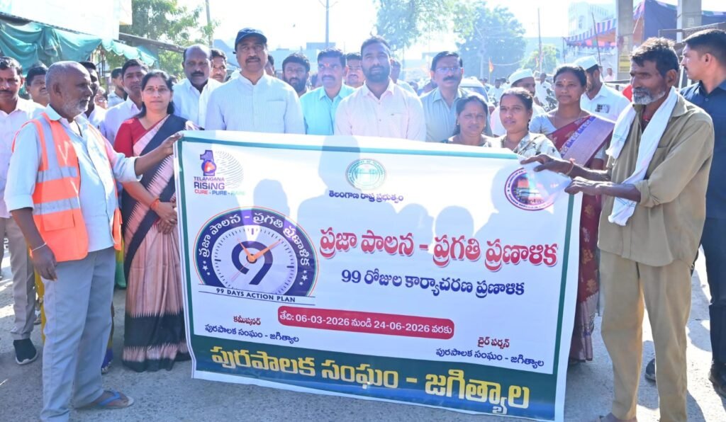 ప్రజా పాలన ప్రగతి ప్రణాళికలో భాగంగా రూపొందించిన 99 రోజుల కార్యాచరణ ప్రణాళిక కార్యక్రమాన్ని జగిత్యాలలో ప్రారంభించారు. ఈ కార్యక్రమాన్ని జిల్లా కలెక్టర్ బి. సత్య ప్రసాద్ , జగిత్యాల ఎమ్మెల్యే సంజయ్ కుమార్ ప్రారంభించారు.ఈ సందర్భంగా ముఖ్యంగా పట్టణ పరిశుభ్రత అంశంపై చర్చించారు. పట్టణంలో పరిశుభ్రతను మెరుగుపరచి, ప్రజలకు శుభ్రమైన వాతావరణాన్ని అందించేందుకు అధికారులు సమన్వయంతో పని చేయాలని సూచించారు. అలాగే 99 రోజుల కార్యాచరణ ప్రణాళికలో భాగంగా అభివృద్ధి పనులను వేగవంతం చేసి ప్రజల సమస్యలను త్వరితగతిన పరిష్కరించాలని అధికారులను ఆదేశించారు.
