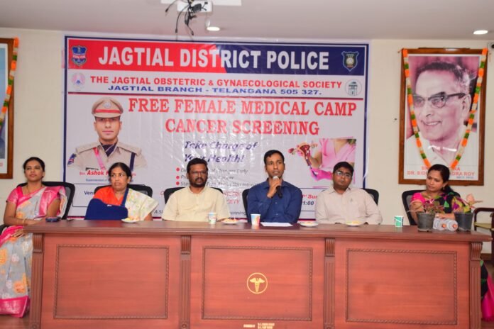 మహిళలలో వచ్చే రొమ్ము, సర్వైకల్ క్యాన్సర్‌ను ముందస్తుగా ఏవిదంగా గుర్తించడం ఈ యొక్క క్యాన్సర్‌ లు రావడానికి గల కారణాలు, క్యాన్సర్ బారిన పడకుండా ముందస్తుగా తీసుకోవలసిన హెచ్ పి వి వ్యాక్సినేషన్ గురించి ఇండియన్ మెడికల్ అసోసియేషన్ జగిత్యాల వారి సహకారంతో ఆదివారం స్థానిక ఐ యం ఏ హాల్ లో జిల్లాలో మహిళా పోలీస్ సిబ్బందికి అవగాహన సదస్సు, హెల్త్ క్యాంప్ ని నిర్వహించారు. ఈ సందర్భంగా జిల్లా ఎస్పి అశోక్ కుమార్ మాట్లాడుతూ.. మహిళలు ఆరోగ్యంగా ఉంటేనే కుటుంబం, తద్వారా సమాజం ఆరోగ్యంగా ఉంటుందని అన్నారు. మహిళలు తమ ఆరోగ్యానికి ప్రాధాన్యత ఇస్తూ తరచూ ఆరోగ్య పరీక్షలు చేయించుకోవాలని సూచించారు. ఈ యొక్క సర్వికల్ క్యాన్సర్ ద్వారా ప్రతి ప్రతి సంవత్సరం వేలాది మంది మహిళలు చనిపోవడం జరుగుతుందని కావున క్యాన్సర్‌ను ముందస్తుగా గుర్తిస్తే ప్రాణాపాయం ముప్పు తగ్గించవచ్చని, అందువల్ల మహిళలు స్వీయ పరీక్ష చేసుకోవాలని తెలిపారు. అనుమానం ఉంటే వెంటనే వైద్యులను సంప్రదించాలని సూచించారు.