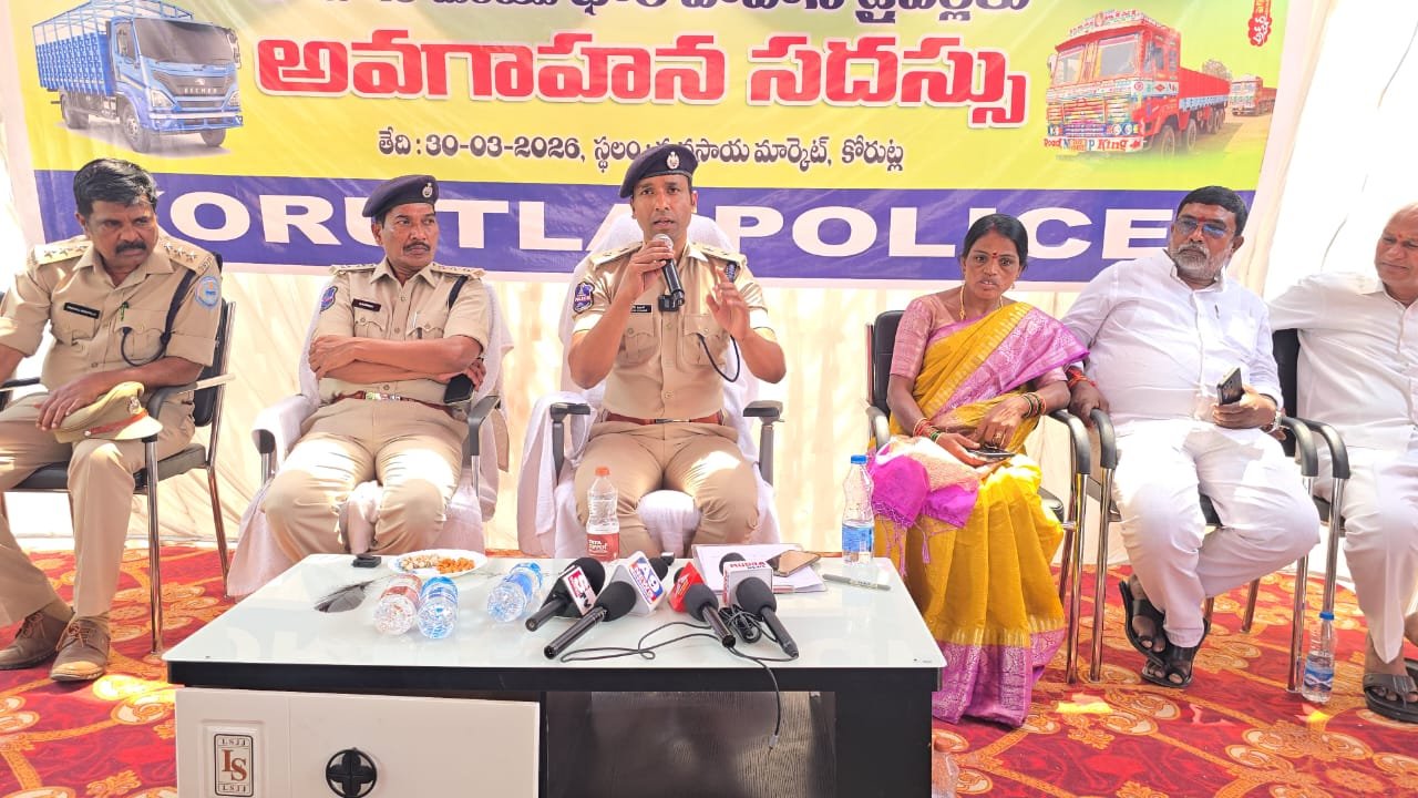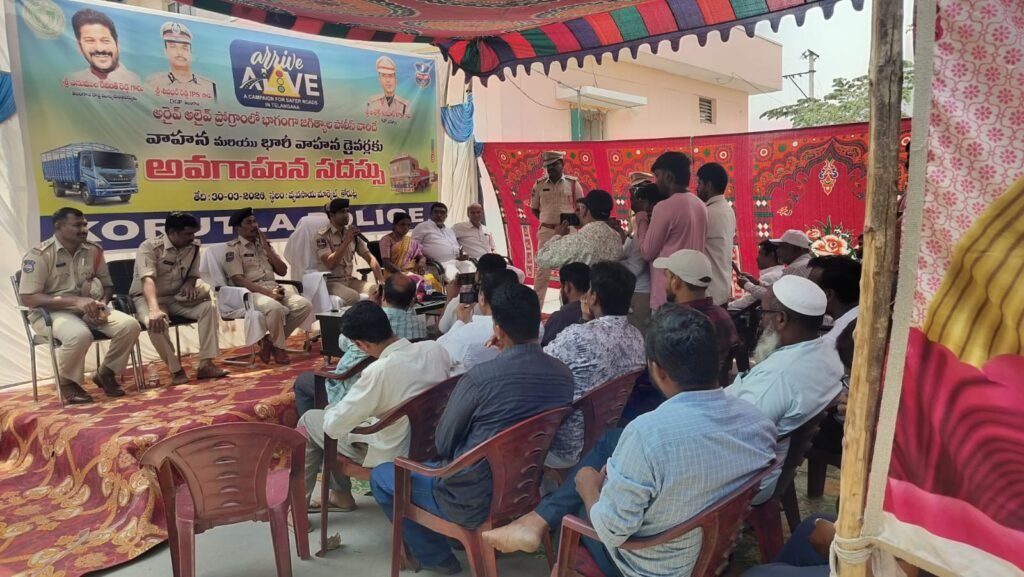 రోడ్డు భద్రతపై విస్తృత అవగాహన కల్పించేందుకు తెలంగాణ పోలీస్ శాఖ ఆధ్వర్యంలో నిర్వహిస్తున్న “Arrive Alive – A Campaign for Safer Roads”కార్యక్రమంలో భాగంగా సోమవారం కొరుట్ల పట్టణంలోని వ్యవసాయ మార్కెట్ కమిటీ కార్యాలయ ఆవరణలో కొరుట్ల, మెట్పల్లి ప్రాంతాలకు చెందిన లారీ, ఐచర్ మరియు ఇతర భారీ వాహనాల డ్రైవర్లు, యజమానుల కోసం ప్రత్యేక అవగాహన సదస్సు నిర్వహించారు. ఈ కార్యక్రమానికి జిల్లా ఎస్పీ అశోక్ కుమార్ ముఖ్య అతిథిగా హాజరై ట్రాఫిక్ నియమాలు, డిఫెన్సివ్ డ్రైవింగ్ ప్రాముఖ్యత, రహదారి భద్రతపై మార్గదర్శకాలు అందించారు.