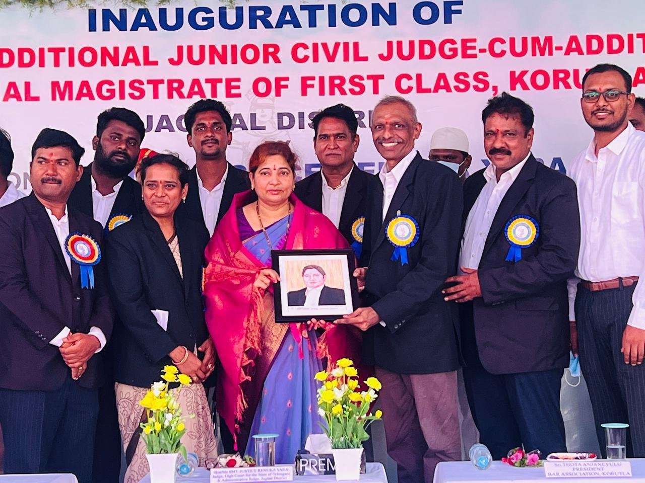 కోరుట్ల పట్టణంలో నూతనంగా ఏర్పాటు చేసిన అదనపు జూనియర్ సివిల్ జడ్జి కోర్టు ప్రారంభోత్సవ కార్యక్రమం అత్యంత వైభవంగా జరిగింది.ఈ కార్యక్రమానికి ముఖ్య అతిథిగా హైకోర్టు న్యాయమూర్తి జస్టిస్ రేణుక యార విచ్చేసి, కోర్టును ప్రారంభించారు.ఈ సందర్భంగా కోరుట్లకు చెందిన ప్రముఖ సీనియర్ న్యాయవాది చాప కిశోర్ స్వయంగా గీసిన జస్టిస్ రేణుక యార అద్భుత చిత్రపటాన్ని  ఆమెకు బహుకరించారు. చిత్రపటాన్ని స్వీకరించిన జస్టిస్ రేణుక యార హర్షం వ్యక్తం చేస్తూ, న్యాయవాది కిశోర్ లోని సృజనాత్మకతను మరియు కళాభిమానాన్ని ప్రత్యేకంగా అభినందించారు.ఈ కార్యక్రమంలో పలువురు న్యాయమూర్తులు, బార్ అసోసియేషన్ ప్రతినిధులు మరియు న్యాయవాదులు పాల్గొని కిశోర్ ప్రతిభను కొనియాడారు.
