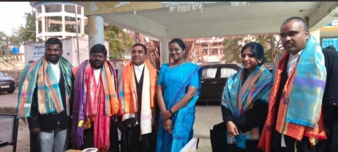 ధర్మపురి స్థానిక కోర్టు బార్ అసోసియేషన్ నూతన కార్యవర్గ సభ్యులు ఘనంగా ప్రమాణ స్వీకారం చేశారు. కోర్టు ప్రాంగణంలో జరిగిన ఈ కార్యక్రమంలో ముఖ్య అతిథిగా ధర్మపురి కోర్ట్ న్యాయమూర్తి శ్రీమతి యేగి జానకి సీనియర్ న్యాయవాదులు, న్యాయవృత్తికి చెందిన పలువురు ప్రముఖులు పాల్గొన్నారు.ఎన్నికల అనంతరం అధ్యక్షులుగా బందేల రమేష్, ఉపాధ్యక్షుడిగా మామిడాల శ్రీకాంత్ కుమార్,ప్రధానకార్యదర్శి రామడుగు రాజేష్,జాయింట్ సెక్రటరీగా ఓరుగంటి చంద్ర శేఖర్,మహిళా ప్రతినిధి గా కలమడుగు కీర్తి లు ప్రమాణ స్వీకారం చేశారు.ఎన్నికల అధికారులుగా గూడ జితేందర్ రెడ్డి,కస్తూరి శరత్ కుమార్ లు వ్యవహరించారు. బాధ్యతలు స్వీకరించిన అధ్యక్షుడు, కార్యదర్శి సహా ఇతర సభ్యులు న్యాయసేవకు కట్టుబడి పనిచేస్తామని ప్రమాణం చేశారు. న్యాయవాదుల హక్కుల పరిరక్షణ,కోర్టు వసతుల అభివృద్ధి, యువ న్యాయవాదులకు మార్గదర్శకత్వం అందించడం తమ ప్రధాన లక్ష్యాలుగా ఉంటాయని తెలిపారు. ఇటువంటి కార్యక్రమాలు న్యాయవాదుల ఐక్యతను బలోపేతం చేస్తాయని వారు పేర్కొన్నారు.ఈ సందర్భంగా పలువురు సీనియర్ న్యాయవాదులు మాట్లాడుతూ, నూతన కమిటీ న్యాయవృత్తి అభివృద్ధికి కృషి చేయాలని సూచించారు.ఈ కార్యక్రమంలో పెద్ద సంఖ్యలో న్యాయవాదులు పాల్గొని ,నూతన కమిటీకి అభినందనలు తెలిపారు.