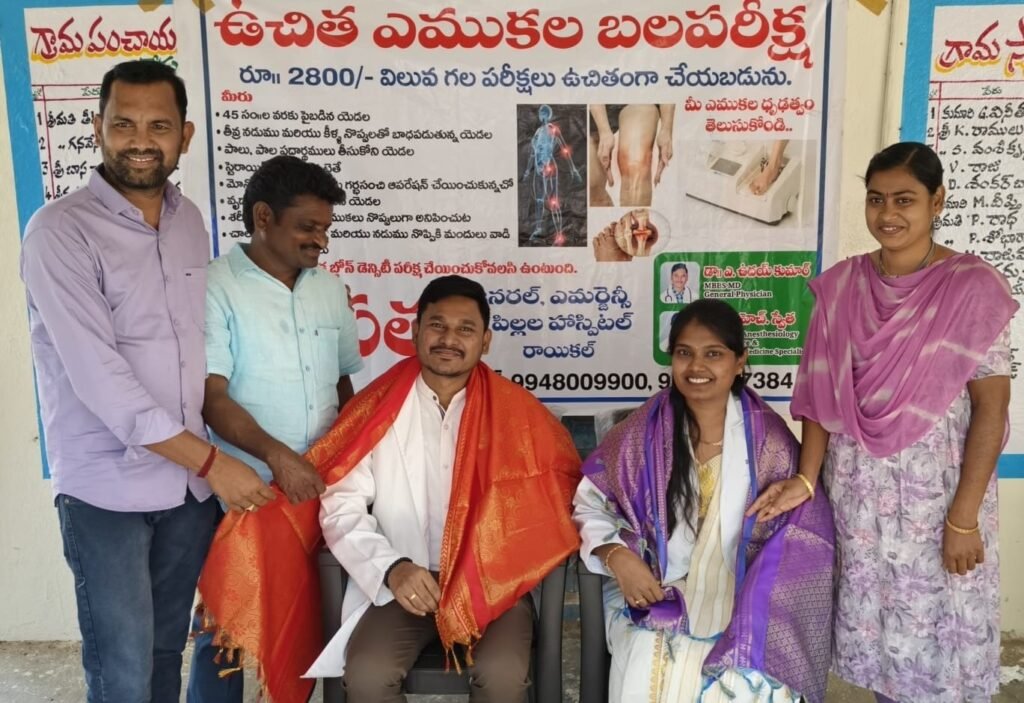 మల్లాపూర్ మండలం లోని రేగుంట గ్రామంలో శ్రీ సత్య హాస్పిటల్స్ సౌజన్యంతో బుధవారం ఉచిత వైద్య శిబిరం నిర్వహించారు. ఉచిత వైద్య శిబిరానికి విశేష స్పందన లభించింది. డాక్టర్ అందె ఉదయ్ కుమార్, డాక్టర్ చొల్లంగి స్వేత లు సుమారు 150 మందికి వైద్య పరీక్షలు బిపి, షుగర్, ఈసిజి జరిపి సంబంధిత మందులు అందజేసి వైద్య సలహాలు తెలియజేశారు. ఈ సందర్భంగా వైద్యులు మాట్లాడుతూ..ఎండ తీవ్రత అధికంగా వున్నందున మద్యాహ్నం సమయంలో బయటకు రాకుడదని వడ దెబ్బ తగలకుండా తగు జాగ్రత్తలు పాటించాలని శరీరం డిహైడ్రేషన్ కాకుండా ఏప్పుడు నీరు, పండ్ల రసాలు త్రాగుతూ ఉండాలని సూచించారు. వడదెబ్బకు గురైన వ్యక్తిని వెంటనే చల్లటి, నీడ ప్రదేశంలోకి తీసుకెళ్లాలని, మెలకువలో ఉంటే మజ్జిగ గాని, ఓఆర్ఎస్ ద్రావణం గాని తాగించాలన్నారు. చల్లటి నీటితో ముఖం కడగాలని సకాలంలో ఆసుపత్రికి తరలించాలని అన్నారు. వైద్యానికి రోజురోజుకీ ఖర్చులు పెరుగుతున్న ఈరోజుల్లో ఉచిత వైద్య శిబిరం నిర్వహించి సేవలందించడంపై గ్రామస్థులు అభినందిస్తూ డాక్టర్ లను ఘనంగా సన్మానించారు. ఈ కార్యక్రమంలో తీట్ల రాజేష్, గనవేని మల్లేష్, కత్తి నరేష్, బైర ఎల్లయ్య, తిప్పవేని సుధాకర్, స్వామి, బైర స్వామి, పొన్నం సంతోష్, బషీర్ తదితరులు పాల్గొన్నారు.